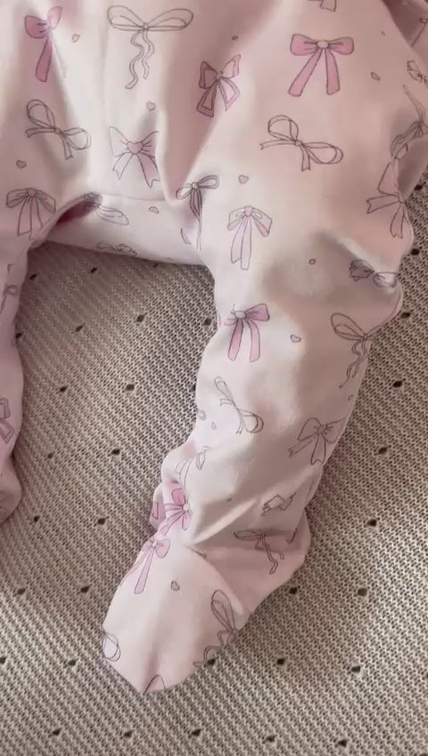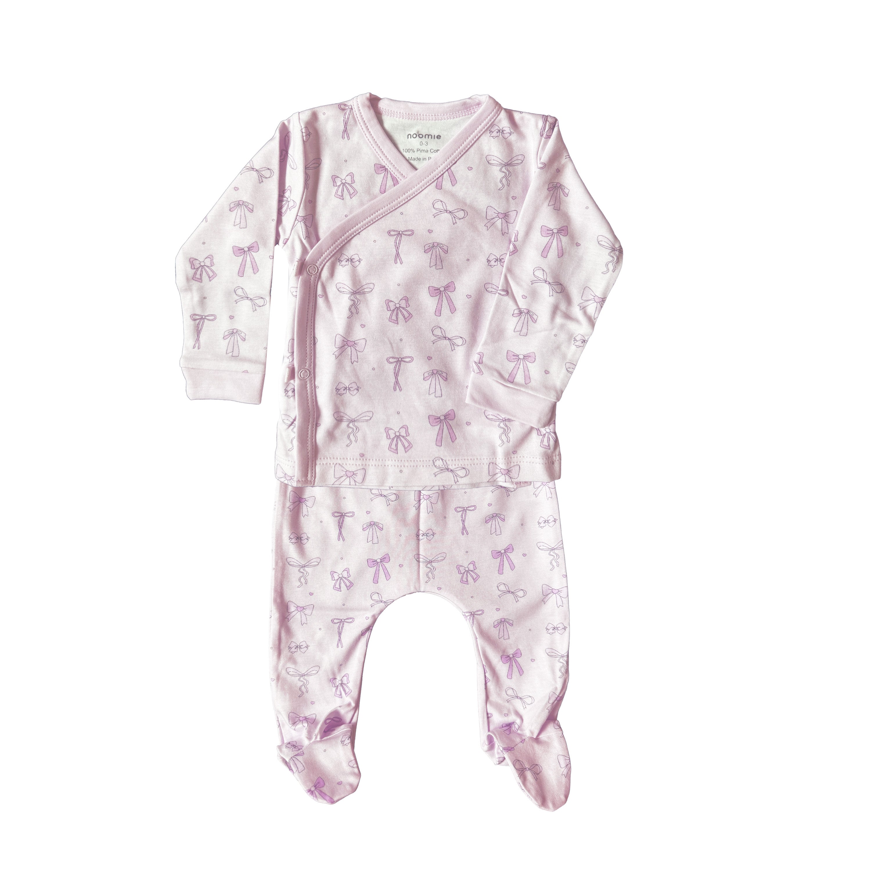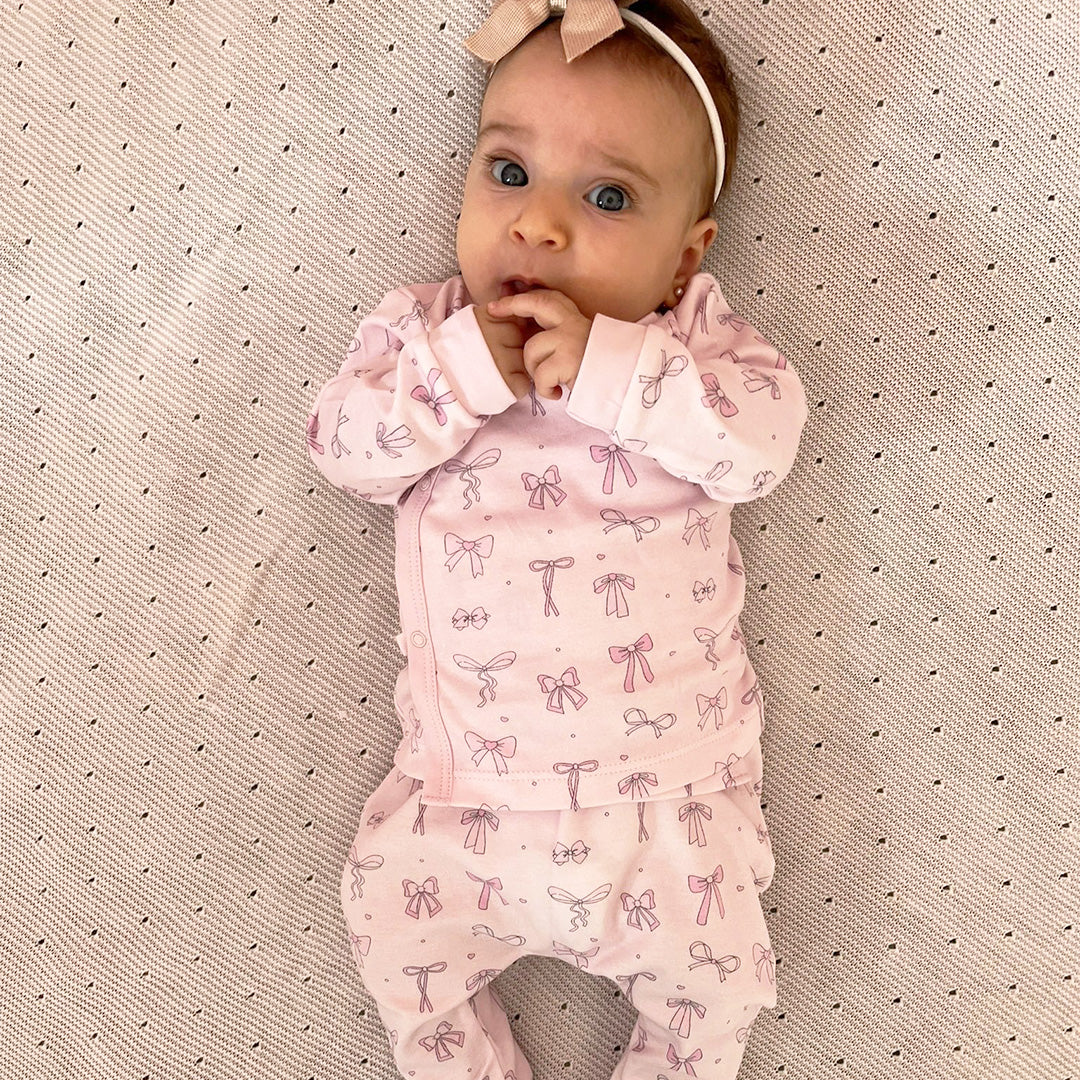 Soft, sweet, and effortlessly stylish. This kimono-style set is made from ultra-soft 100% Pima cotton and features a delicate bows print on a pink background. The wrap design makes dressing easy, while the matching footed pants keep baby cozy from head to toe. Perfect for everyday snuggles or gifting a new arrival.