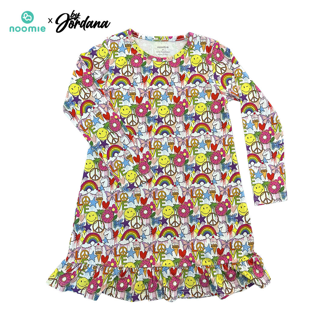 Noomie x @byjordana is happy to introduce our latest collaboration for the spring season featuring color drips of all girls' favorites, featuring rainbows, unicorns, donuts, and more. This dress is perfect for the girly girls who love to twirl.