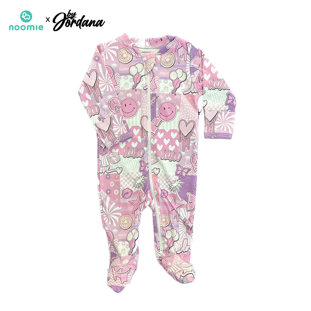 This girl zipper footie features @byjordana's signature color drip art, bringing together happy faces, hearts, butterflies, and peace signs in a delightful and whimsical pattern. Each element is carefully crafted to inspire joy and creativity in every wear. The playful motifs make this baby girl onesie stand out in any baby girl's wardrobe.